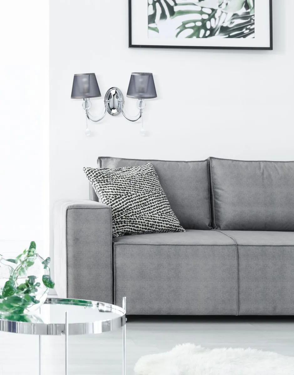 Основание/металл/ хром. Абажур/текстиль/дымчатый. Декор/акрил, хрусталь/прозрачный.