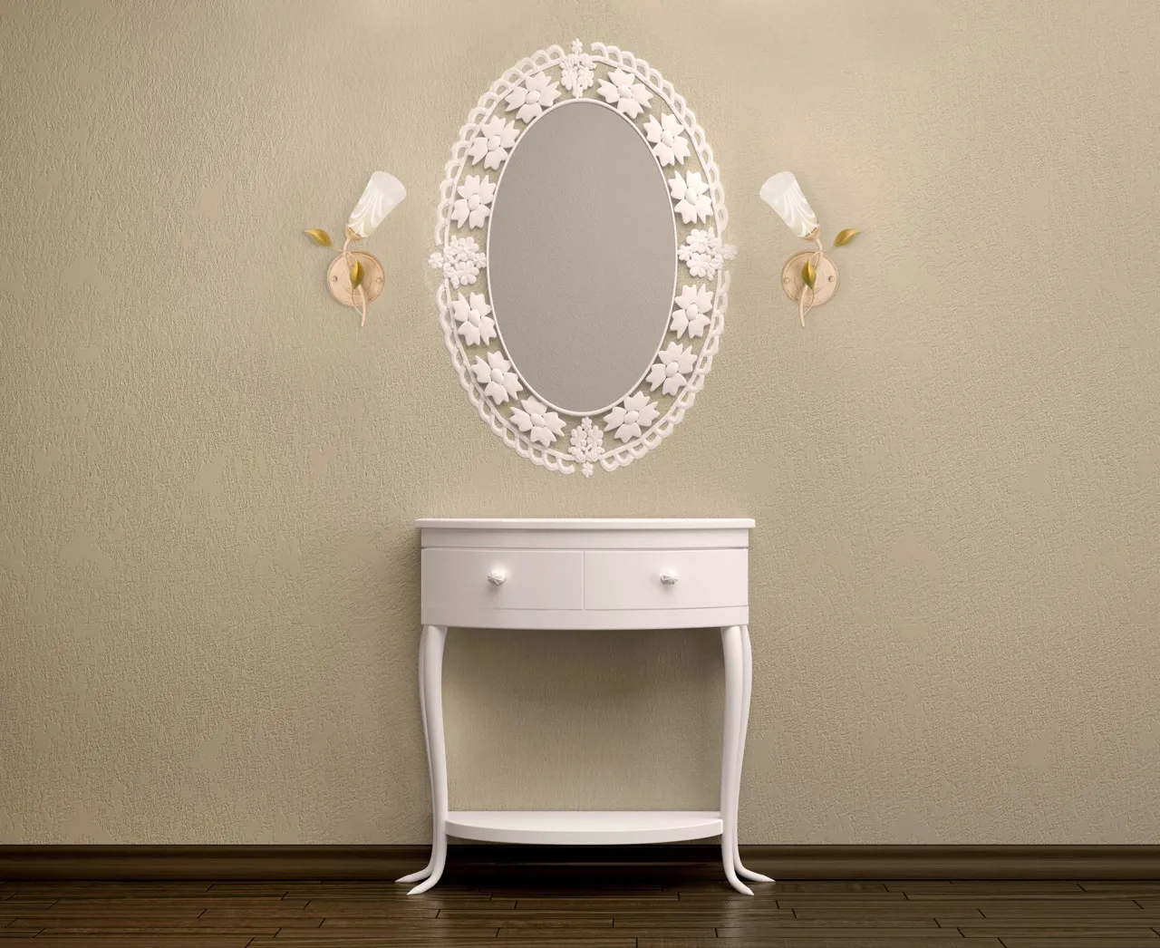 Металлическое основание белого цвета с патиной в цвет золота. Плафон: матовое стекло. Декор: металл