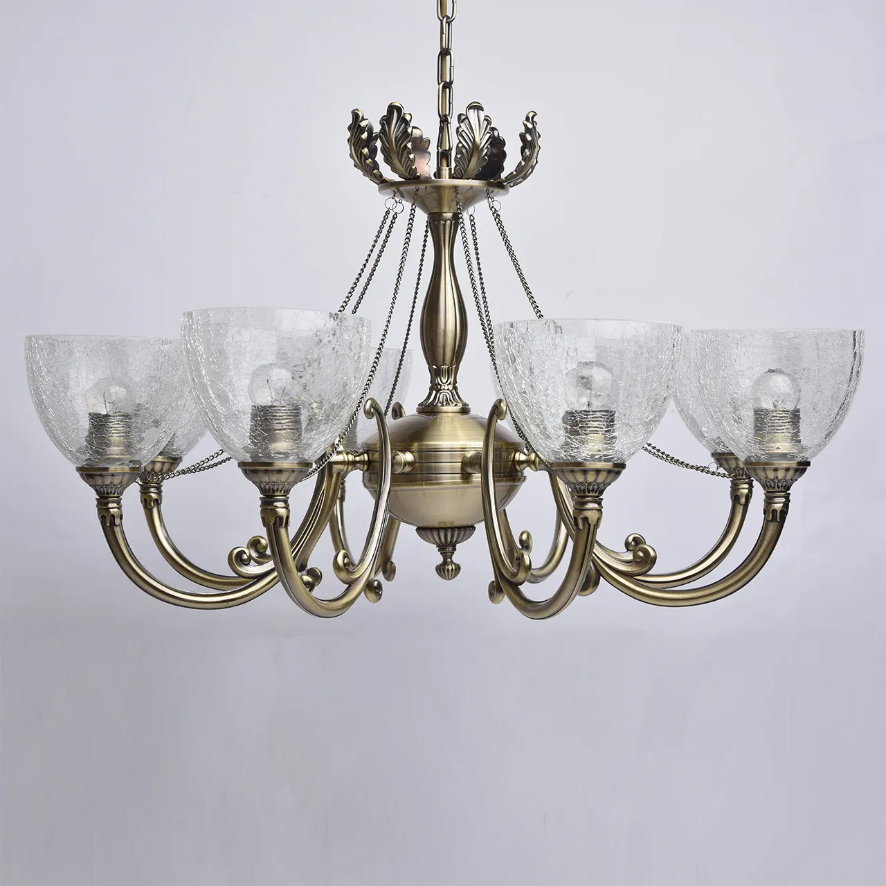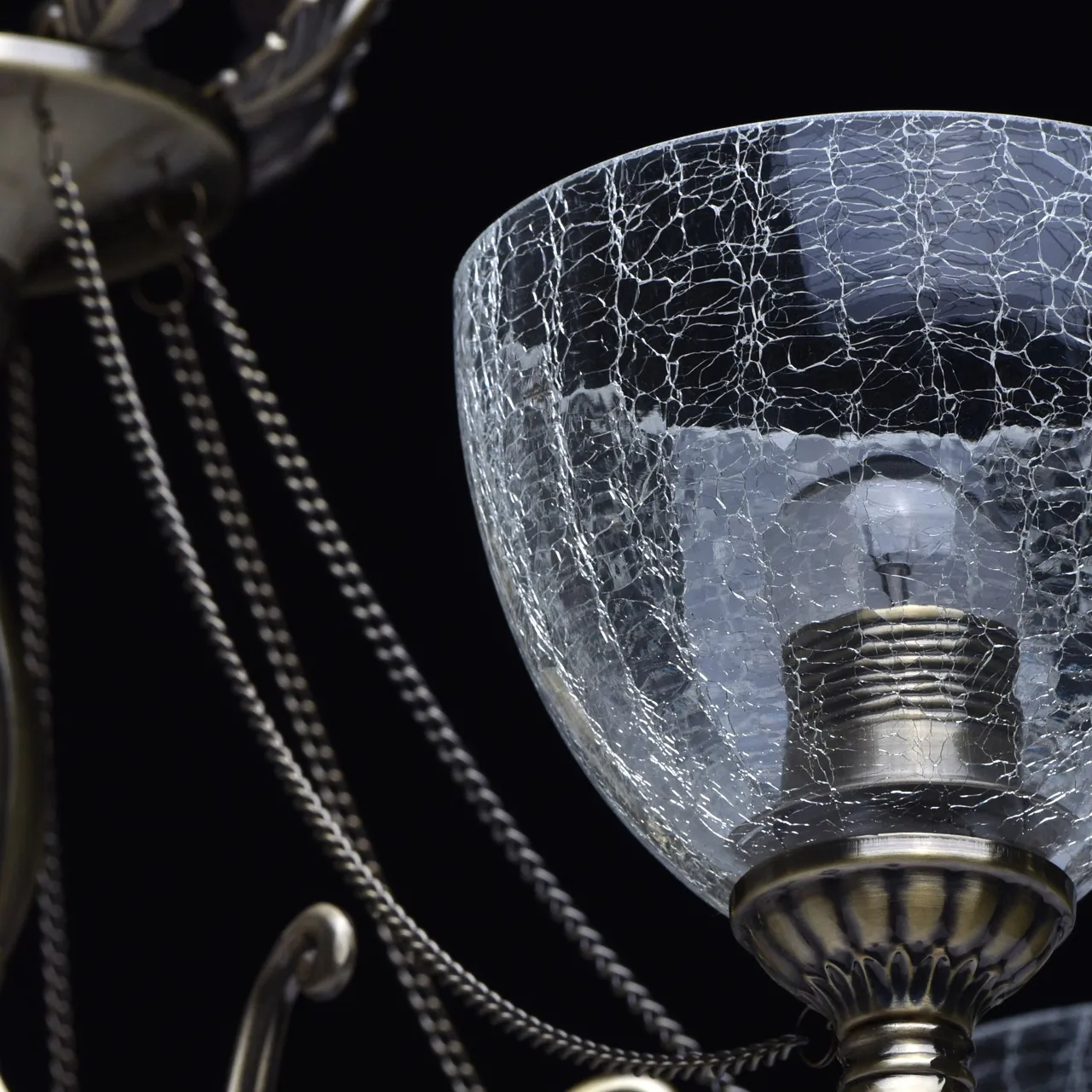 Металлическое основание цвета античной бронзы, плафоны из льдистого стекла, декоративные элементы и