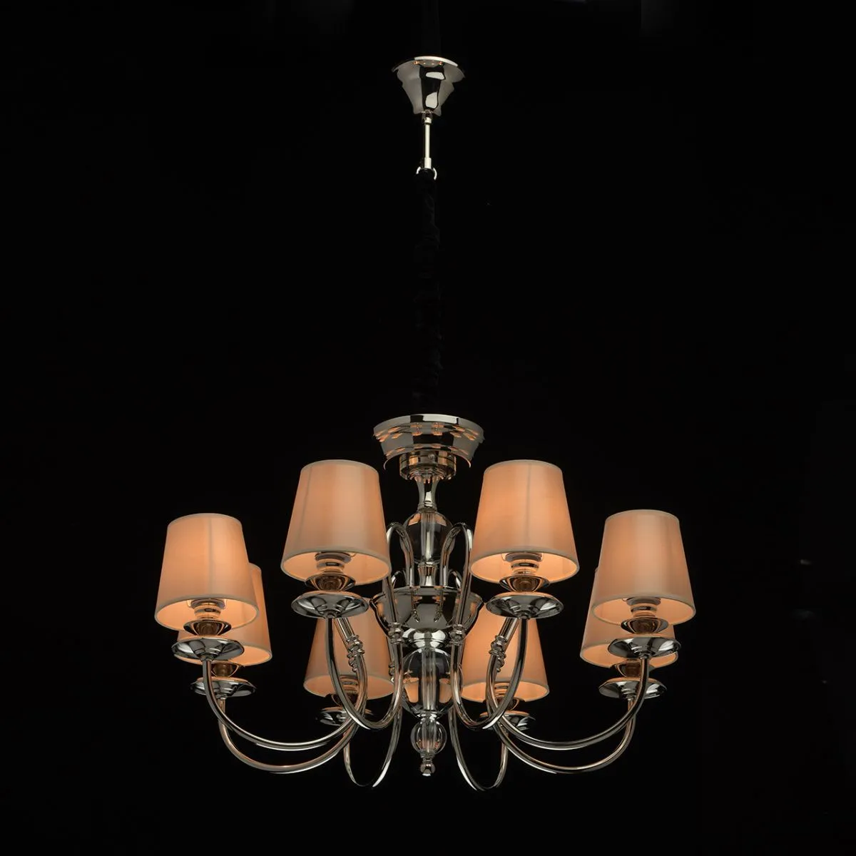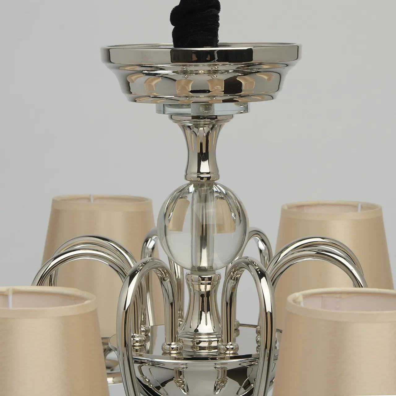 Металлическое основание цвета хрома. Декор: хрусталь. Текстильные абажуры бежевого цвета.
