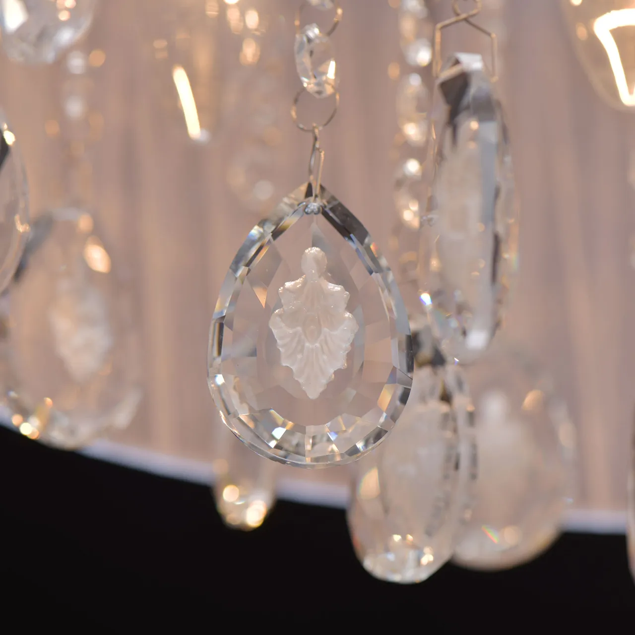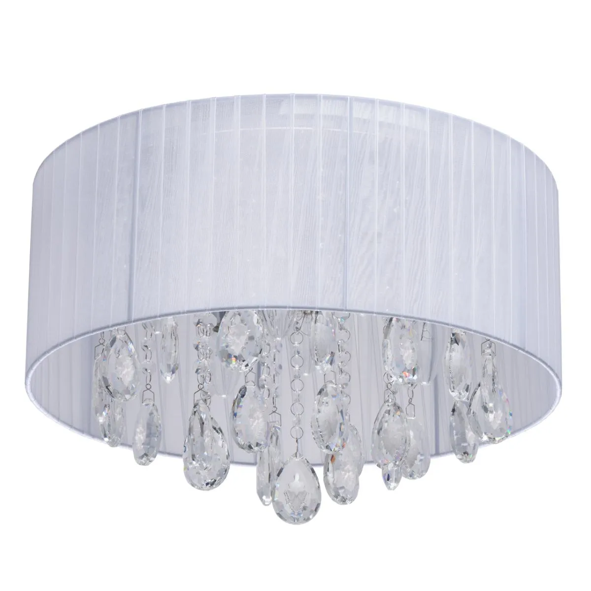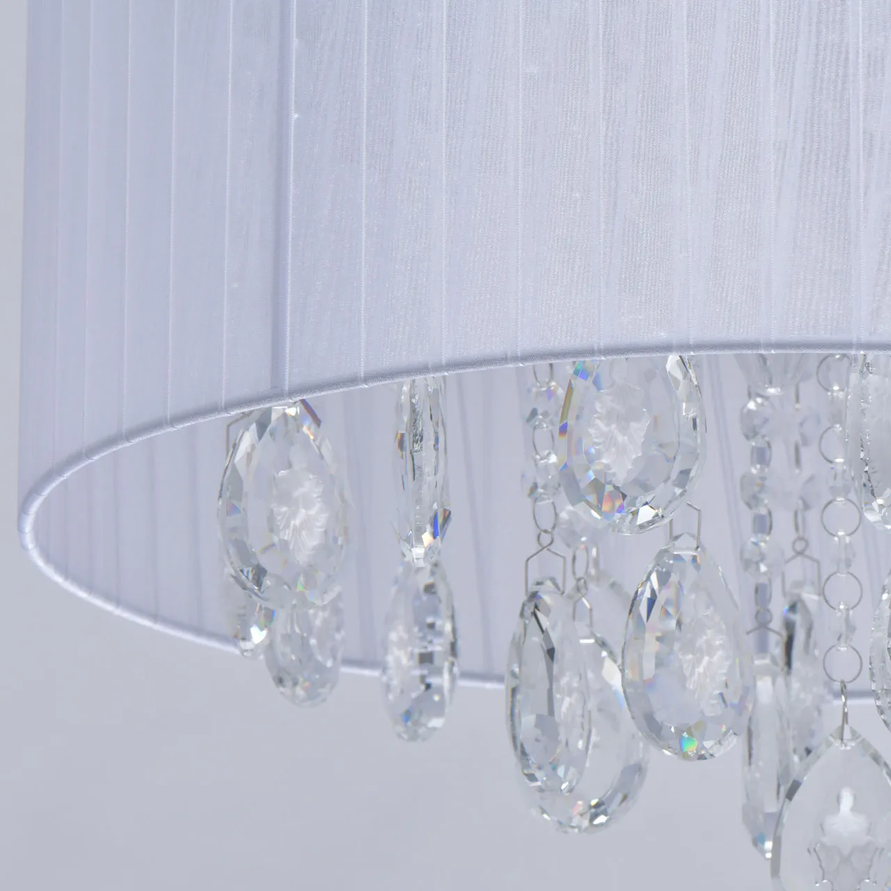 Основание/металл Плафон/текстиль/белый Декор/хрусталь с резным белым орнаментом